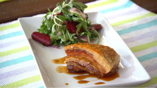 Wipe the pork skin with paper towel to soak up any extra moisture from the skin, and score in 1cm intervals in a crisscross pattern, be careful not to go too deep and cut the meat.